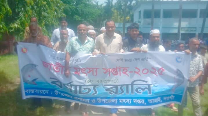 “অভয়াশ্রম গড়ে তুলি,দেশি মাছে দেশ ভরি” এই স্লোগানকে সামনে রেখে মাছের পোনা অবমুক্ত , বর্ণাঢ্য র্যালী ও মত বিনিময় সভার মধ্য দিয়ে নওগাঁর আত্রাইয়ে জাতীয় মৎস্য সপ্তাহ ২০২৫ পালন করা হয়।