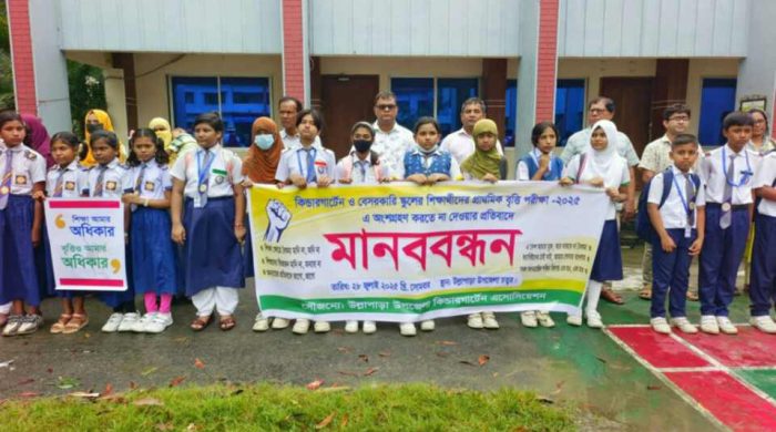 মানববন্ধনে উল্লাপাড়া সানফ্লাওয়ার স্কুলের পঞ্চম শ্রেণীর শিক্ষার্থী পড়াক্রম কুন্ডু বলেন, বৃত্তি পরীক্ষা সব শিক্ষার্থীর অধিকার। সরকারি-বেসরকারি বিভাজন করে শিশুদের শিক্ষা-অধিকার হরণ করা হচ্ছে। আমরা এই বৈষম্য মানি না মানবো না