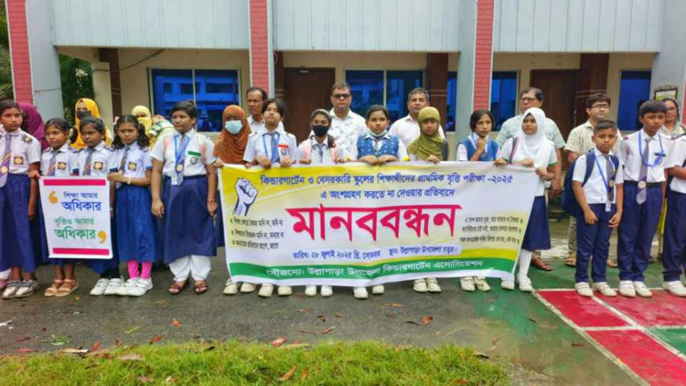 ২০২৫ সালের প্রাথমিক বৃত্তি পরীক্ষায় সান ফ্লাওয়ার কিন্ডার গার্টেন ও বেসরকারি স্কুলের শিক্ষার্থীদের অংশগ্রহণ করতে না দেওয়ার সিদ্ধান্তের প্রতিবাদ উল্লাপাড়ায় মানববন্ধন করেছেন অভিভাবক, শিক্ষক ও শিক্ষার্থীরা।