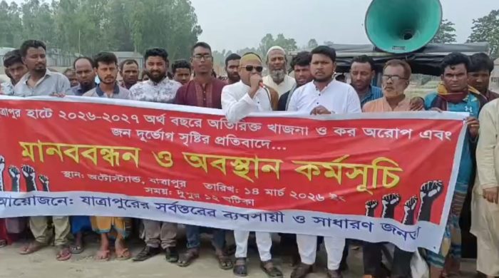 ১৪ মার্চ (শনিবার) দুপুর ১২টায় যাত্রাপুর হাটের অটো স্ট্যান্ডে ২০০৬-২৭ অর্থ বছরে অতিরিক্ত ইজারা মূল্য আরোপের প্রতিবাদে ঘন্টাব্যাপী মানববন্ধন ও অবস্থান কর্মসূচিতে অংশগ্রহণ করে শত শত ব্যবসায়ী ও সাধারণ মানুষ।