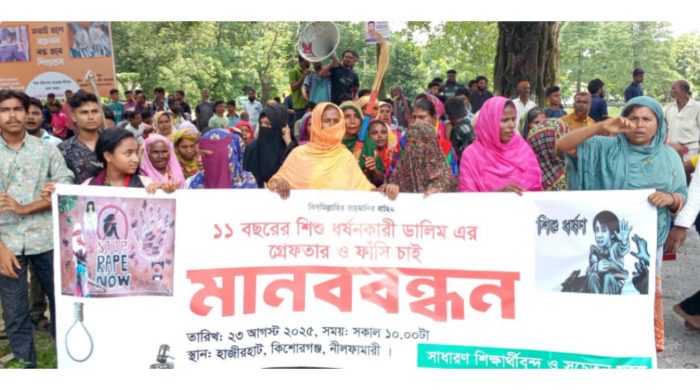 এসময় বক্তারা বলেন, অবিলম্বে ধর্ষক ডালিমকে গ্রেফতার পূর্বক ফাঁসি দিতে হবে। যাতে আর কেউ এ রকম কাজে সাহস না পায়। আমরা আমাদের শিশুদের নিরাপত্তা চাই।