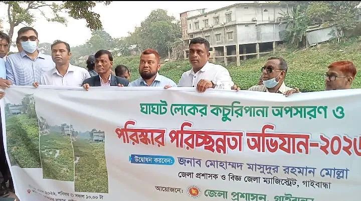 মশাবাহিত ডেঙ্গু রোগ প্রতিরোধে গাইবান্ধা পৌরসভার ঘাঘট লেকে সপ্তাহব্যাপী কঁচুরিপানা অপসারণ ও পরিস্কার পরিচ্ছন্নতা অভিযানের উদ্বোধন করা হয়েছে। আজ শনিবার বেলা ১১ টার দিকে জেলা প্রশাসনের আয়োজনে ও গাইবান্ধা পৌরসভার সহযোগিতায় সদর ভুমি অফিসের সামনে এই ঘাঘট লেকের কঁচুরিপানা অপসারন ও পরিস্কার পরিচ্ছন্নতা অভিযানের উদ্বোধন করা হয়।