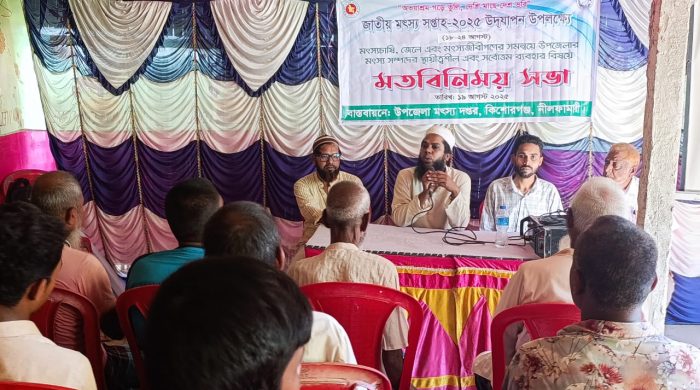 উপজেলা মৎস্য দপ্তর বাস্তবায়নে “অভয়াশ্রম গড়ে তুলি, দেশি মাছে দেশ ভরি” এই প্রতিবাদ্যকে সামনে রেখে জাতীয় মৎস্য সপ্তাহ-২০২৫ উৎযাপন উপলক্ষ্যে নীলফামারীর কিশোরগঞ্জে মৎস্যচাষি, জেলে এবং মৎস্যজীবীগণের সাথে উপজেলার মৎস্য সম্পদের স্থায়ীত্বশীল এবং সর্বোত্তম ব্যবহার বিষয়ে মতবিনিময় সভা অনুষ্ঠিত হয়েছে।