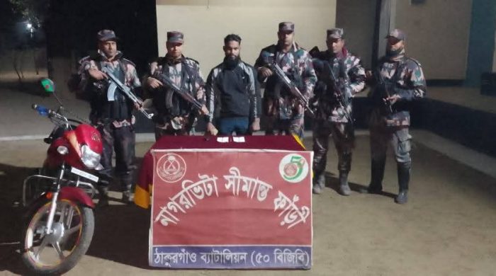 বিজিবি জানায়, সীমান্ত পিলার ৩৭৭/২-এস থেকে প্রায় দুই কিলোমিটার ভেতরে বালিয়াডাঙ্গীর ‘বেলতলা’ এলাকায় বিশেষ অভিযান চালানো হয়। এ সময় মো. আনোয়ার হোসেন (৩৫)—পিতা ইসরাইল হোসেন, গ্রাম রতনদিঘী, পোস্ট সমীরনগর, থানা বালিয়াডাঙ্গী, জেলা ঠাকুরগাঁও—কে আটক করা হয়।