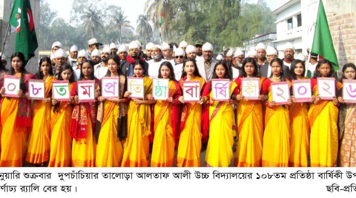 দুপচাঁচিয়া উপজেলার ঐতিহ্যবাহী তালোড়া আলতাফ আলী উচ্চ বিদ্যালয়ের ১০৮তম প্রতিষ্ঠা বার্ষিকী নানা কর্মসূচির মধ্য দিয়ে উদযাপন করা হয়েছে। এ উপলক্ষে শুক্রবার (১৬ জানুয়ারি) দিনব্যাপী আয়োজনের মধ্যে ছিল ম্যারাথন, বর্ণাঢ্য র্যালি, আলোচনা সভা ও দোয়া মাহফিল।সকালে জাতীয় সংগীত ও ম্যারাথনের মধ্য দিয়ে কর্মসূচির সূচনা হয়। সকাল ১০টায় বিদ্যালয় চত্বর থেকে একটি বর্ণাঢ্য র্যালি বের হয়ে তালোড়া বাজার এলাকার গুরুত্বপূর্ণ সড়ক প্রদক্ষিণ করে। র্যালিতে শিক্ষক-শিক্ষার্থী, অভিভাবক ও স্থানীয় গণ্যমান্য ব্যক্তিবর্গ অংশগ্রহণ করেন।