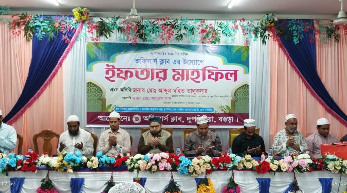 দুপচাঁচিয়ায় অফিসার্স ক্লাব এর উদ্যোগে ইফতার মাহফিল অনুষ্ঠিত হয়েছে। ৯ মার্চ সোমবার উপজেলা মডেল মসজিদ ও ইসলামিক সাংস্কৃতিক কেন্দ্রে উপজেলা নির্বাহী অফিসার ও অফিসার্স ক্লাবের সভাপতি শাহরুখ খানের সভাপতিত্বে ও একাডেমির সুপারভাইজার শাহ মোঃ মাহামুদুন্নবী এর পরিচালনায় বক্তব্য রাখেন অফিসার্স ক্লাবের সাধারণ সম্পাদক ও খাদ্য নিয়ন্ত্রক মনিরুল হক, বিদায়ী রূপালী ব্যাংকের শাখা ব্যবস্থাপক আব্দুল আলিম, ডাঃ হাসিবুল জ্জামান, নবাগত নেসকো নির্বাহী প্রকৌশলী ওমর ফারুক, রূপালী ব্যাংকের শাখা ব্যবস্থাপক মোতাহার হোসেন, উপজেলা মৎস্য কর্মকর্তা ফারহান ফায়েজ, বিএমডিএ কর্মকর্তা গোলাম মুর্তজা। এসময় উপস্থিত ছিলেন সহকারী কমিশনার(ভৃমি) তৌহিদুল ইসলাম, উপজেলা স্বাস্থ্য ও পরিবার পরিকল্পনা কর্মকর্তা ডাঃ মেহেদী হাসান, থানার পুলিশ পরিদর্শক তদন্ত নাসিরুল ইসলাম,উপজেলা বিএনপির সভাপতি একেএম মনিরুল ইসলাম খান স্বপন, সাধারণ সম্পাদক আব্দুর রহিম, পৌর বিএনপির ভারপ্রাপ্ত সভাপতি এ্যাড.সাইফুর রহমান, সাধারণ সম্পাদক আখতারুজ্জামান তুহিন, উপজেলা যুবদলের আহŸায়ক আফছার আলী, দুপচাঁচিয়া প্রেসক্লাবের সভাপতি গোলাম ফারুক, উপজেলা প্রেসক্লাবের সভাপতি আবু কালাম আজাদ সহ ইউনিয়ন পরিষদ চেয়ারম্যানগন ও বিভিন্ন দপ্তরের কর্মকর্তাগন। ইফতার পৃর্বে দেশের জাতির সমদ্বি কামনায় দোয়া করেন মডেল মসজিদের পেশ ইমাম জোবায়েদ হোসেন। নবাগত ও বিদায়ী কর্মকর্তাদের সংবর্ধনা প্রদান করা হয়।