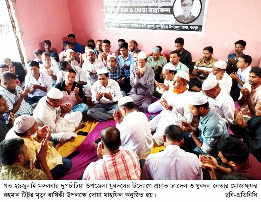 বগুড়ার দুপচাঁচিয়া উপজেলা যুবদলের উদ্যোগে উপজেলা ছাত্রদলের সাবেক সভাপতি ও যুবদলের সাবেক সিনিয়র যুগ্ম আহ্বায়ক মোজাফ্ফর রহমান টিটুর প্রথম মৃত্যুবার্ষিকী উপলক্ষে স্মরণ সভা ও দোয়া মাহফিল অনুষ্ঠিত হয়েছে।