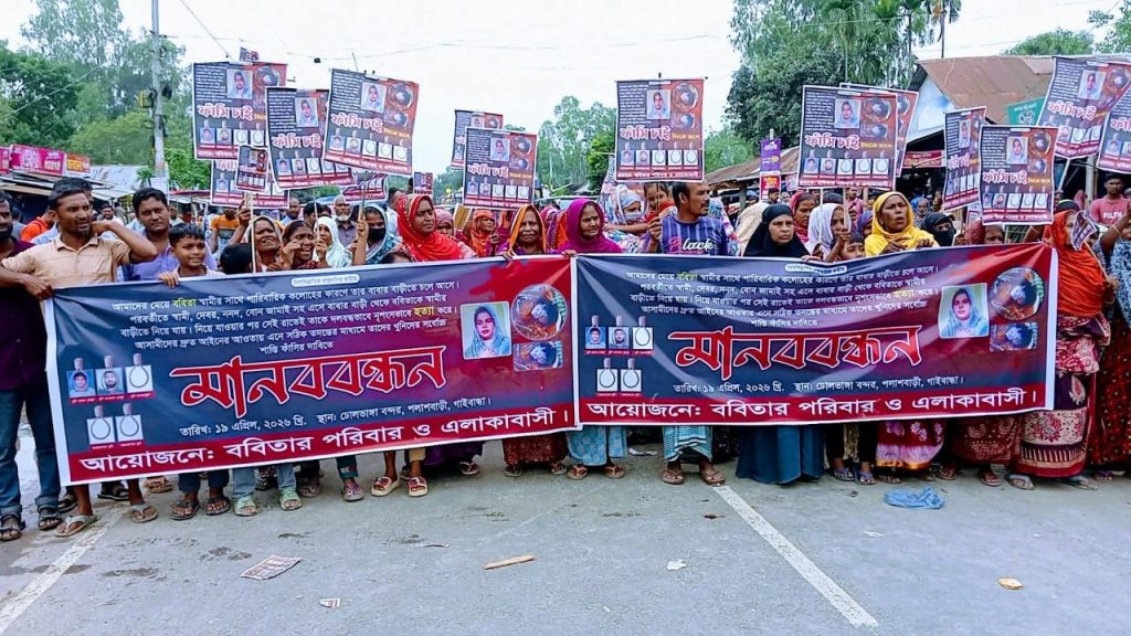 গাইবান্ধার পলাশবাড়ীতে গৃহবধূ ববিতা হত্যাকারীদের দ্রুত গ্রেফতার ও সর্বোচ্চ শাস্তির দাবিতে মানববন্ধন, সড়ক অবরোধ ও বিক্ষোভ সমাবেশ করেছে এলাকাবাসী।