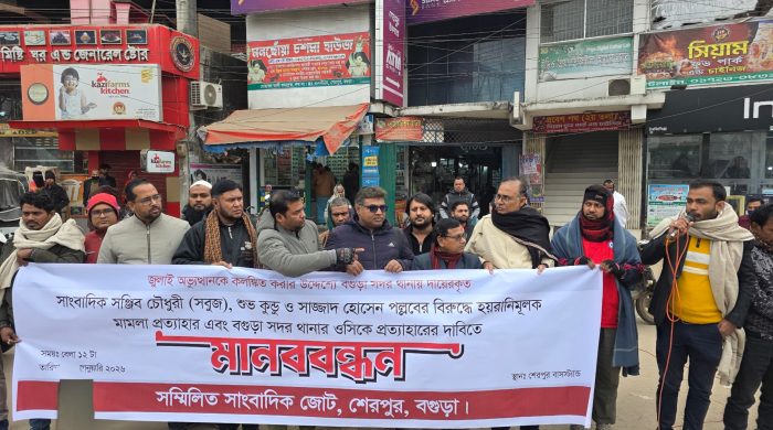 বগুড়ার শেরপুর উপজেলা প্রেসক্লাবের সাধারণ সম্পাদক ও দৈনিক প্রথম আলোর প্রতিনিধিসহ তিন সাংবাদিককে হত্যাচেষ্টা মামলায় জড়ানোর প্রতিবাদে বিক্ষুব্ধ হয়ে উঠেছে শেরপুর। সোমবার (৫ জানুয়ারি) দুপুরে বগুড়া-ঢাকা মহাসড়কের শেরপুর করতোয়া বাসস্ট্যান্ড এলাকায় ‘সম্মিলিত সাংবাদিক জোট’-এর ব্যানারে এক বিশাল মানববন্ধন ও প্রতিবাদ সমাবেশ অনুষ্ঠিত হয়। সমাবেশ থেকে সাংবাদিকরা ওই মামলা থেকে তিন সাংবাদিকের নাম প্রত্যাহার এবং কোনো যাচাই-বাছাই ছাড়াই মামলা গ্রহণ করায় বগুড়া সদর থানার ভারপ্রাপ্ত কর্মকর্তার (ওসি) অপসারণ দাবি করেন। সম্মিলিত সাংবাদিক জোটের সমন্বয়ক রঞ্জন কুমার দে-র সভাপতিত্বে অনুষ্ঠিত এই কর্মসূচিতে শেরপুর উপজেলা প্রেসক্লাব, শেরপুর থানা প্রেসক্লাব, উত্তরবঙ্গ সাংবাদিক সংস্থা, সাংবাদিক উন্নয়ন সোসাইটি ও বাংলাদেশ প্রেস ক্লাবের সকল সদস্যরা অংশ নেন।...