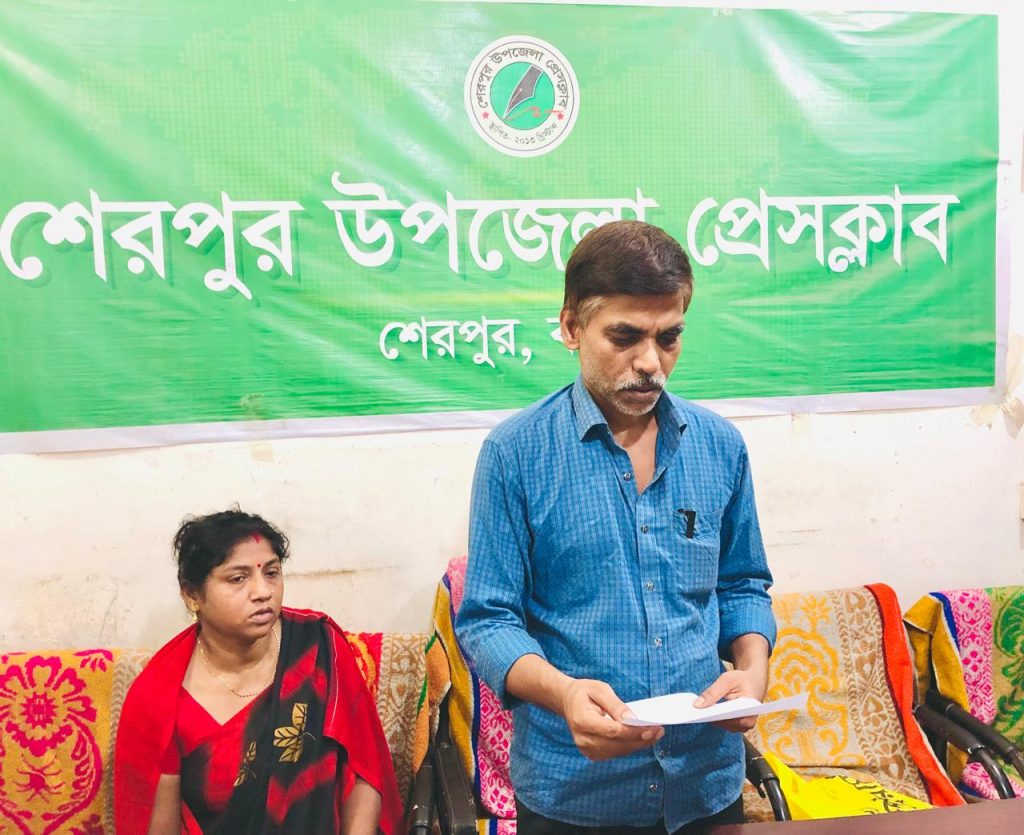 সংবাদ সম্মেলনে পৌর শহরের বসাকপাড়া এলাকায় মৃত নিরঞ্জন মহন্তের ছেলে দিলীপ মোহন্ত তার লিখিত বক্তব্য বলেন, প্রায় ৭০ বছর যাবত শেরপুর পৌর মৌজার জেএল নং ১০৯ খতিয়ান ১/১ দাগ নং ৬৫৫, শ্রেণী-বাড়ী, প্রায় ৩.০০ শতাংশ জমির উপরে ঘরবাড়ী নির্মাণ করে বসবাস করে আসছে আমার পিতামহের কাল থেকে অদ্যবধি আমরা। দীর্ঘদিন ধরে খাস খতিয়ানভূক্ত জমিতে বসবাস করার ফলে আমরা পৌরকর নিয়মিত ও বিদ্যুৎ সংযোগপূর্বক বিল পরিশোধ করে আসছি। কিন্ত হঠাৎ করে একই এলাকার দেবাশিষ কিশোর মুন্সী, জয় কিশোর মুন্সী, সুবল কিশোর মুন্সী, ধ্রবজ্যেতি কিশোর মুন্সী সহ কয়েকজন বিগত সালের প্রথম দিকে সেই খাস খতিয়ান সম্পত্তিটি তাদের পৈত্বিক সম্পত্তি দাবী করে আমাদেরকে জায়গা ছেড়ে দিতে নানাভাবে চাপ ও হুমকী দেয়। এরপর ক্ষমতাসীন আওয়ামীলীগ সরকারের পতনের পর আর বিবাদীরা জায়গা উদ্ধার বা ছেড়ে দেয়ার জন্য আগ্রহ দেখায় না। এরপর চলতি বছরের গত ২৪ জুলাই বৃহস্পতিবার সকাল সাড়ে ১০টার দিকে ওই বিবাদীগণেরা উচ্ছেদ করার অপচেষ্টার বহিঃপ্রকাশ হিসেবে আমাদেরকে বাড়ীর গেটে তালা লাগিয়ে দেয়। এসময় আমি ও আমার স্ত্রী কাজলী মোহন্ত ঘরের মধ্যে আটকা পড়ে অবরুদ্ধ থাকি। এর প্রেক্ষিতে আমরা কয়েকঘন্টা অবরুদ্ধ থাকার পর আমি সরকারি সেবা প্রাপ্তি জন্য ৯৯৯- এ ফোন করার প্রেক্ষিতে থানা পুলিশ এসে আমাদের বাড়ীর তালা খুলে আমাদেরকে অবমুক্ত করেন। এর আগে গত ২১ জুলাই বিবাদীরা আমাদের বাড়ীঘর ছাড়ার জন্য নানা হুমকী ধামকী ও ভয়ভীতি প্রদর্শন করে। এতে আমরা গরীব ও অসহায় মানুষ ওইসব প্রভাবশালীদের হুমকী-ধামকীতে জীবনের নিরাপতা হীনতায় ভূগছি।