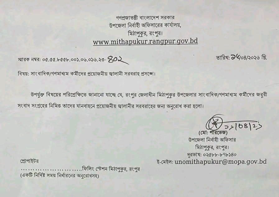 জানা গেছে, মিঠাপুকুর উপজেলা নির্বাহী কর্মকর্তার কার্যালয় থেকে জারি করা এক অফিসিয়াল পত্রে স্থানীয় সাংবাদিক ও গণমাধ্যম কর্মীদের সংবাদ সংগ্রহের কাজে ব্যবহৃত যানবাহনের জন্য প্রয়োজনীয় জ্বালানি সরবরাহে সহযোগিতা প্রদানের অনুরোধ জানানো হয়েছে। চিঠিতে বলা হয়, মাঠপর্যায়ে সংবাদ সংগ্রহে সাংবাদিকদের নিয়মিত চলাচলের প্রয়োজন হয়, যা নিরবচ্ছিন্ন রাখতে এ ধরনের সহায়তা গুরুত্বপূর্ণ।