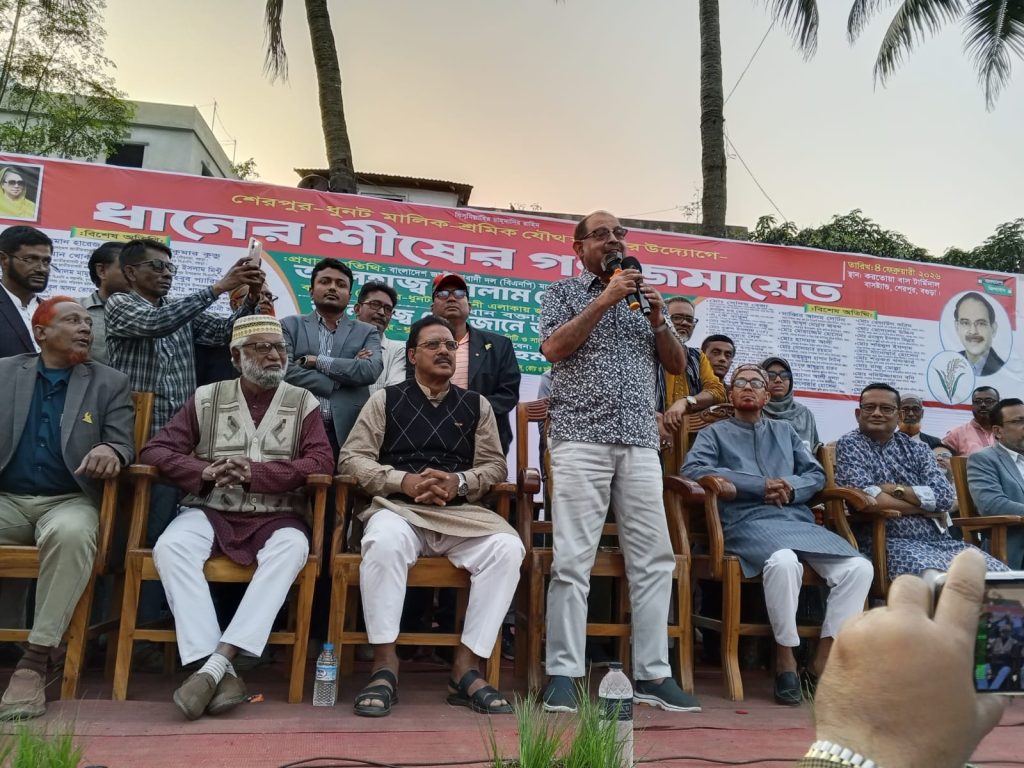 শেরপুরে ধানের শীষের গণজমায়েতে শ্রমিকদের কল্যাণে কাজ করার অঙ্গীকার জিএম সিরাজের