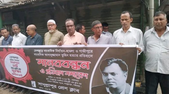 সাংবাদিক নির্যাতন ও তুহিন হত্যার প্রতিবাদে আজও সাদুল্লাপুরে সাংবাদিকদের মানববন্ধন।