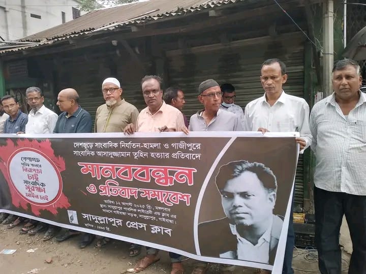 সারাদেশে সাংবাদিকদের ওপর হামলা, মামলা ও নির্যাতন এবং গাজীপুরে সাংবাদিক আসাদুজ্জামান তুহিনকে প্রকাশ্যে হত্যার প্রতিবাদে গাইবান্ধার সাদুল্লাপুরে মানববন্ধন অনুষ্ঠিত হয়েছে।