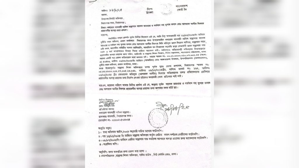 সিরাজগঞ্জ ধলডোব বাগবাটী দাখিল মাদ্রাসার সুপারের গাছ জমি দখলের অভিযোগ।
