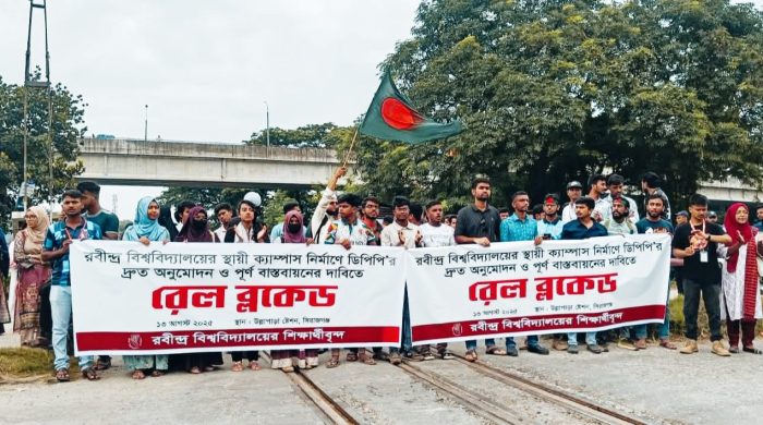রবীন্দ্র বিশ্ববিদ্যালয়ের শিক্ষার্থীরা স্থায়ী ক্যাম্পাসের দাবিতে সিরাজগঞ্জের উল্লাপাড়ায় রেলপথ অবরোধ করেছে।