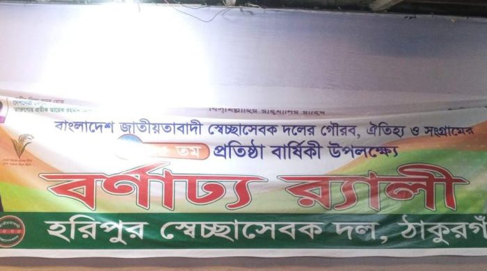 ঠাকুরগাঁও হরিপুর উপজেলার বাংলাদেশ জাতীয়তাবাদী সেচ্ছাসেবক দলের ৪৫তম প্রতিষ্ঠাবার্ষিকী উপলক্ষে বর্ণাঢ্য র্যালি, আলোচনা সভা ও বৃক্ষরোপণ কর্মসূচি অনুষ্ঠিত হয়েছে।